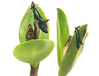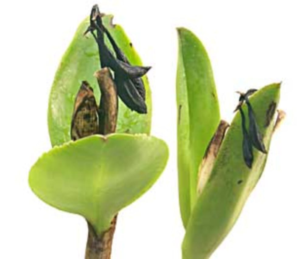 Under- or overwatering is a common cause of bud blast. If a plant becomes too dry, it may withdraw moisture from buds as a survival mechanism. Overwatering can damage the orchid’s root system, with the end result being a lack of water to the plant. As with underwatering, when the plant is unable to absorb sufficient quantities of water, it will withdraw water from the buds, bringing about their demise. Budding Cattleyas are particularly sensitive to overwatering, which can cause buds to blacken and die while still in their sheath. Water that is allowed to sit on buds or in bud sheaths provides the perfect environment for fungi and bacterial growth, generating rots that will blast buds. Watering with cold water can shock a plant, causing bud drop.