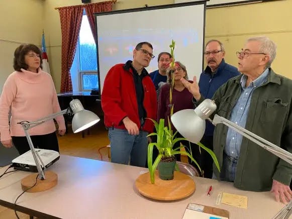You do not have to be an AOS member to exhibit a blooming orchid at a monthly judging and there is no entry fee. We do require that your plant have a correct species or hybrid name and be free of pests. It’s also a good idea to clean your plant up a bit (wipe off the leaves, and remove any dead leaves or old inflorescences), and possibly stake the inflorescence, so that the flowers are shown to their best advantage.