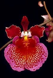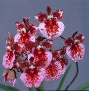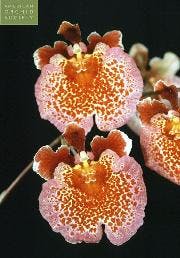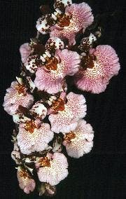 In the early 1950s, the legendary W.W. Goodale Moir of Hawaii pioneered Tolumnia breeding when he began crossing the species he had collected on his business trips to the West Indies. The first 25 years of activity was dominated by his efforts. By the 1970s the potential he was coaxing out of "Moir's weeds," as they were called, encouraged others to join the pursuit. The most active of these were Richard and Stella Mizuta and Robert and Susan Perreira, also of Hawaii. The foundation Moir had painstakingly laid was about to bear fruit. Tolumnia Golden Sunset (Stanley Smith x Tiny Tim) was made by the Perreiras, and registered by Francis Aisaka in 1975. It is a fairly simple hybrid that combined four of the five species Moir believed to be the most significant in Tolumnia breeding: Tolu. pulchella contributed its genes for pink color, large size, full shape and good presentation on a long, often branching inflorescence. Tolu. triquetra supplied the potential for spots and assorted patterns, and a compact plant habit. It also offered shortening of the inflorescence as well as its propensity to branch. And Tolu.guianensis (formerly called Onc. desertorum, filled out the petal shape, enhancing overall roundness of the flowers. Tolu. urophylla offered its yellow color, good size and rather expanded lip.