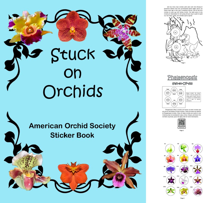 Stuck on Orchids is a 16-page coloring and sticker book with 51 full-color stickers. The book describes seven genera of orchids, Phalaenopsis, Cattleya, Cymbidium, Oncidium, Vanda, Dendrobium, and Paphiopedilum, providing fun facts about each genus, along with general orchid information and QR Codes that link to the AOS Care and Culture Sheets.