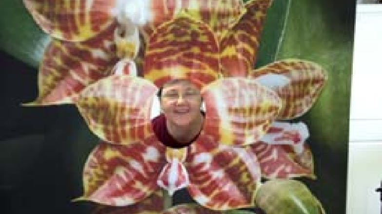 The Houston Orchid Society created a “Photo Panel” to stand at the corner of our orchid show and catch people’s attention. The Kid’s Corner consisted of a table of activities and a hanging vinyl photo (4’ x 6’) of an orchid. The vinyl poster hung from a photographers frame and had the center cut out of one of the flowers for children’s (or adult’s) faces. Parents or friends took photos of their children’s/friends faces in the flowers. This month I will include detailed instructions so your club can create this very successful activity.