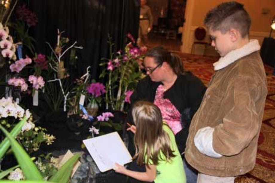 This activity is for older children with the primary purpose of getting them to pay attention to the show. Each child is given a pencil and a folder. Stapled to the inside of the folder are pictures on one side and a chart the child fills in on the other side. The photos are pictures of orchid flowers that have been entered in the show. Number the pictures. The challenge is to see how many of the flowers the child can find and identify in the show. In the chart, the child should write the number of the flower, the name on the label and the name/number of the exhibit for each flower found. Ten or more of these empty charts can be stapled to the folder. When the child returns the filled out folder and the pencil, pin a mini-ribbon on the child’s shirt. Keep the folder and rip off the child’s form. (You can give that to the child to keep.) The folder is now ready for the next child.