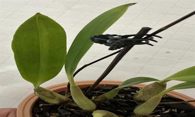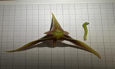 One flower and two buds on two sequential inflorescences up to 32 cm; dorsal sepal rolled, lateral sepals elongate, folded, chartreuse, veined and overlaid oxblood proximally, yellow distally; petals chartreuse, striped oxblood; lip yellow, overlaid and spotted mahogany; column chartreuse, fanged parallel to column; anther cap yellow; substance firm; texture waxy.