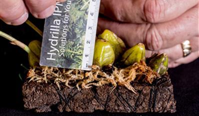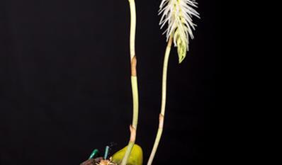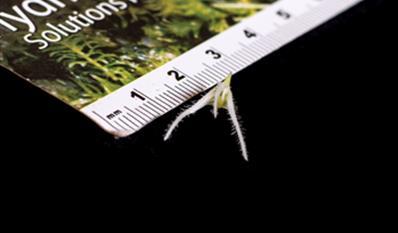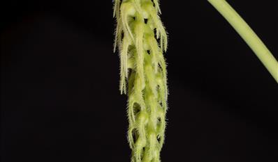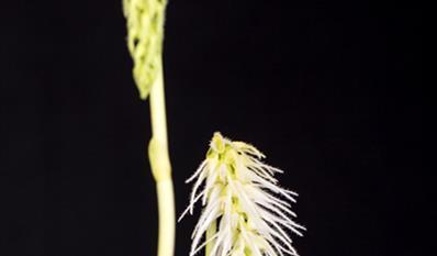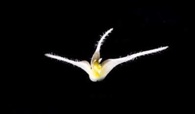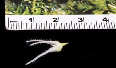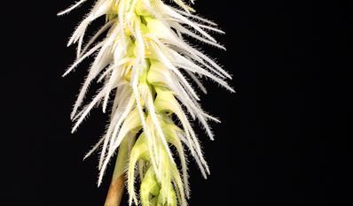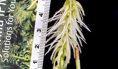 Thirty-two flowers and eight buds on one 13.8cm upright inflorescence with sharply pendant apex, second immature inflorescence; plant 8cm x 3cm grown on a 10.5-cm x 6-cm cork slab with sphagnum moss; pseudobulbs bulbous, leafless, 2.6cm x 2.4cm; flowers porrect; sepals and petals white; sepals needle-like, marginally hispid; petals minute; lip recurved, cream-yellow; column and anther cap cream-yellow, two teeth on upper column; substance soft; texture slight sheen