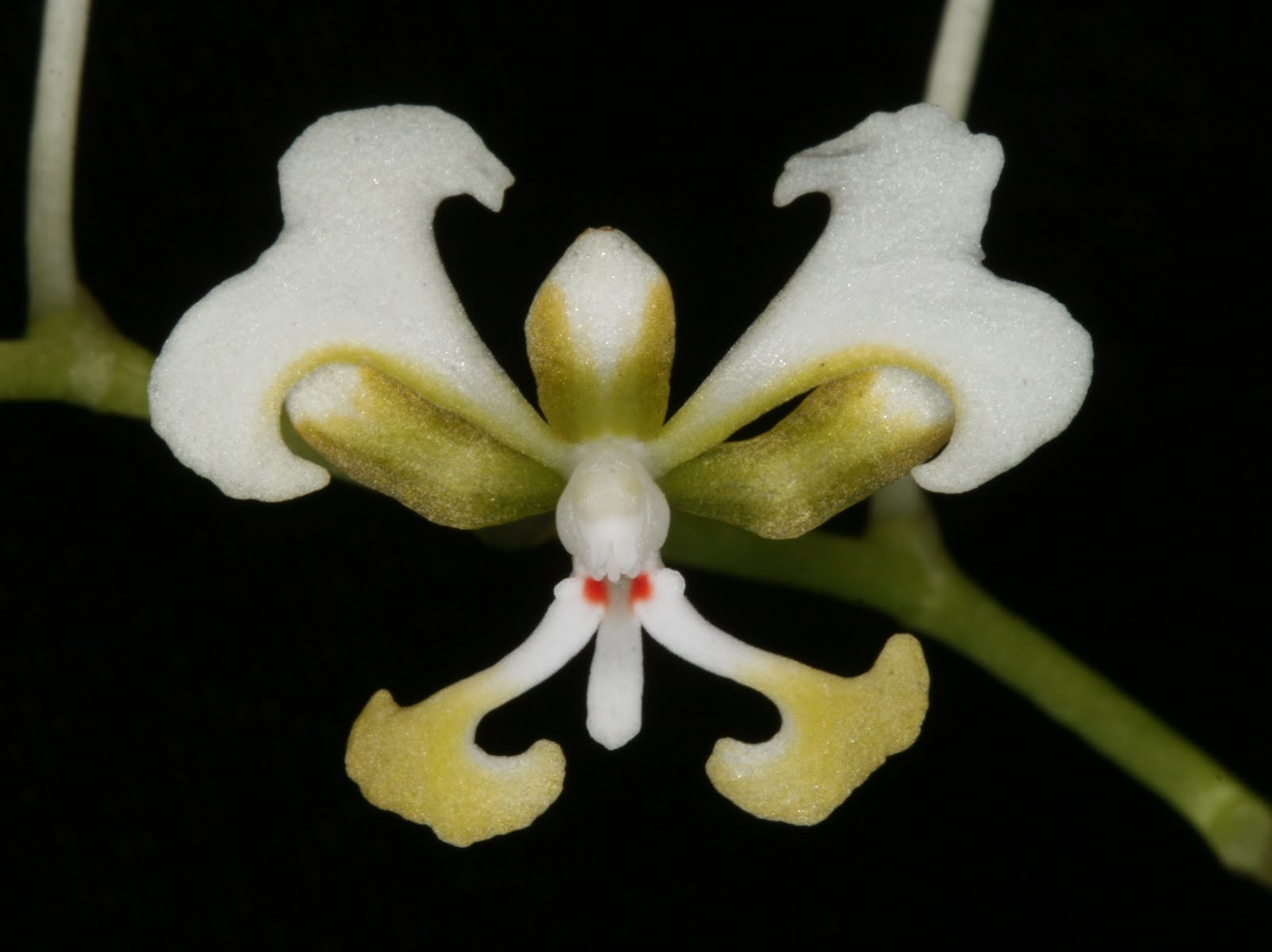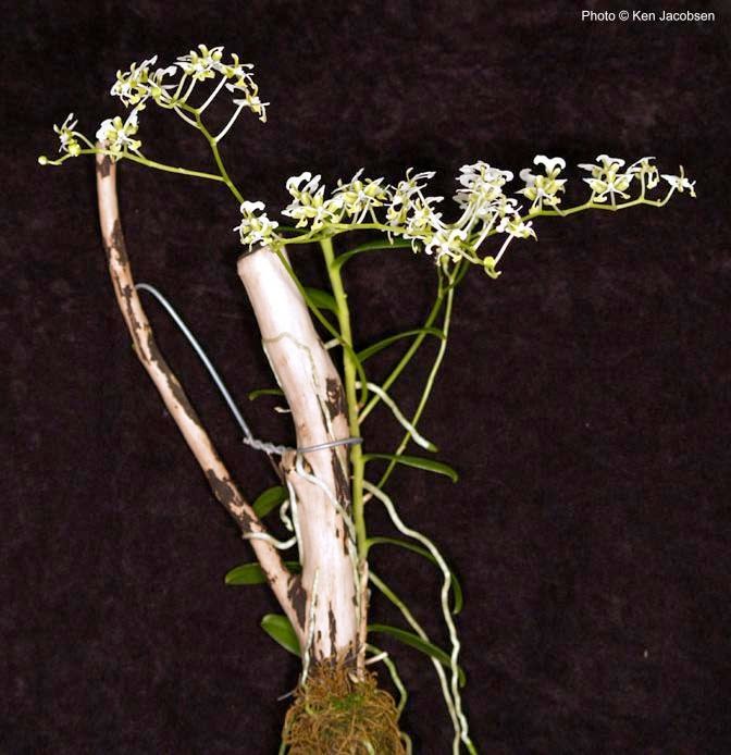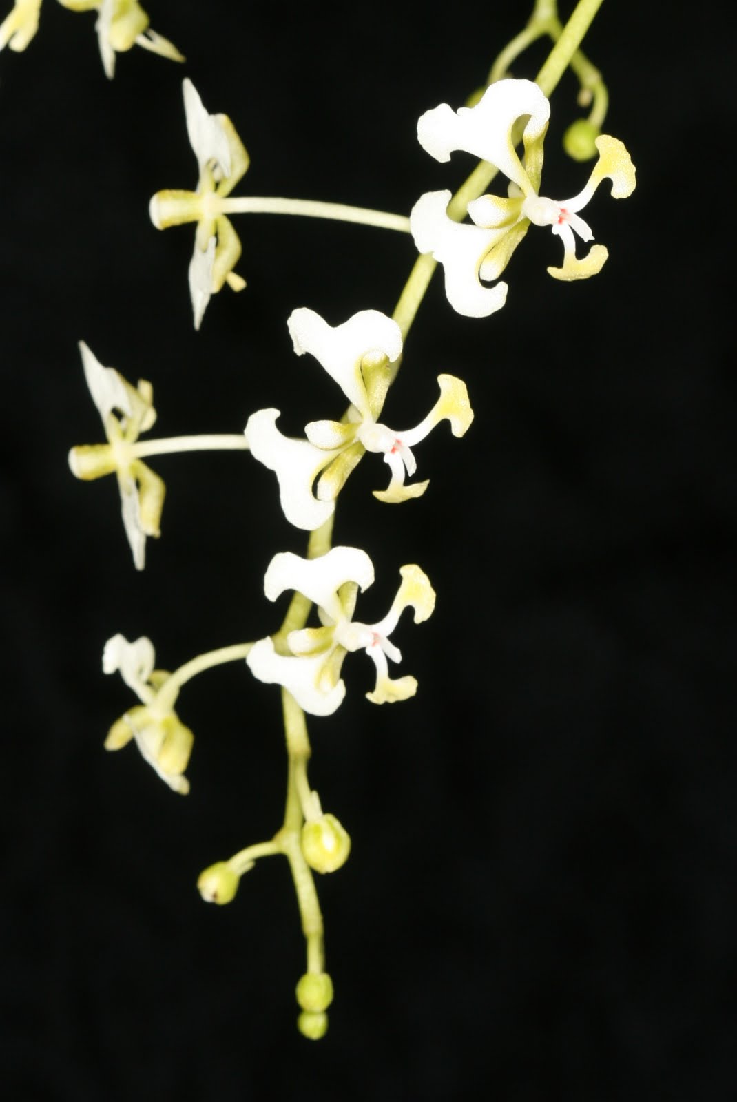 Description: Thirty-six flowers and four buds on two branching inflorescences, one immature inflorescence with four buds; flowers resupinate; dorsal sepal white edged chartreuse; petals bilobed, upperlobe white shaped fleur de lys, lower lobe chartreuse; lateral sepals chartreuse, fleur de lys shaped; lip white with two red dots centrally; texture matte. Plant mounted on driftwood. Reedstem growth with 5.5-cm. leaves. Species native to Madagascar.