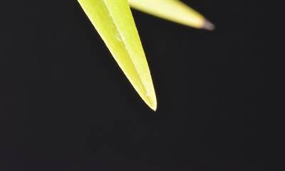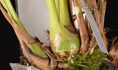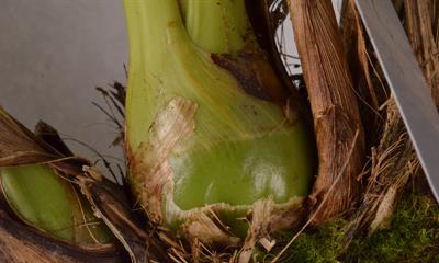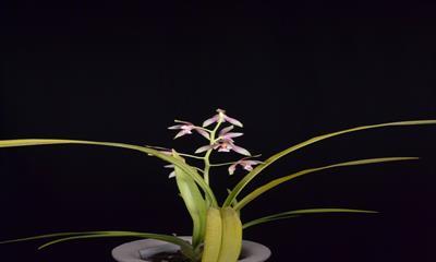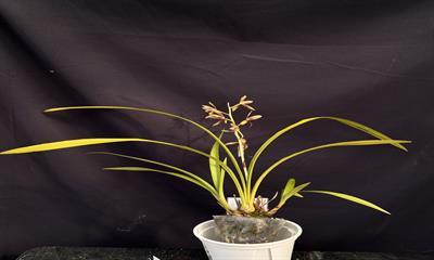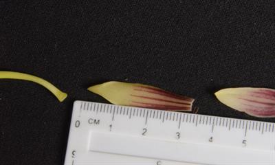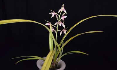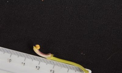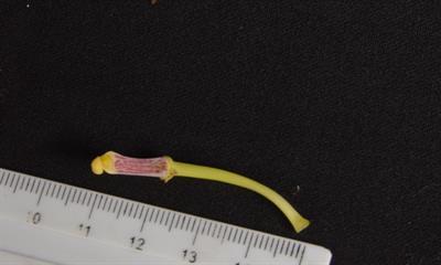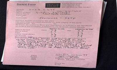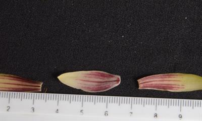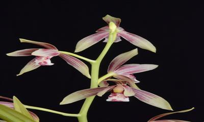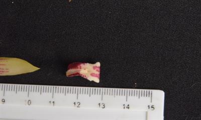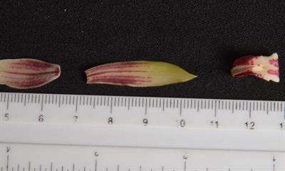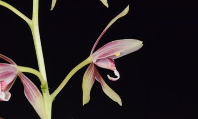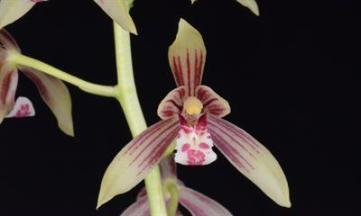 Seven flowers and one bud on one upright 34-cm inflorescence; sepals lanceolate, acute, slightly porrect, cream veined dark red; petals lanceolate, acute, porrect, cream veined dark red; lip lanceolate, obtuse, recurved, white, blotched red distally, overlaid red proximally, callus yellow; column cream, anther cap cream; substance firm; texture matte.