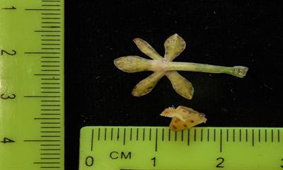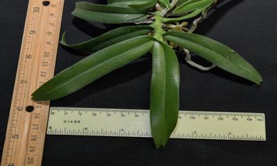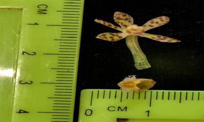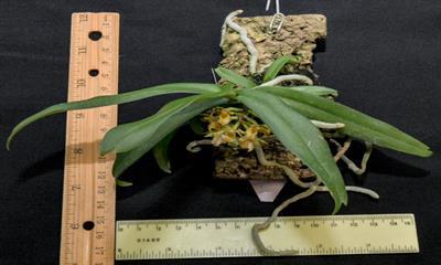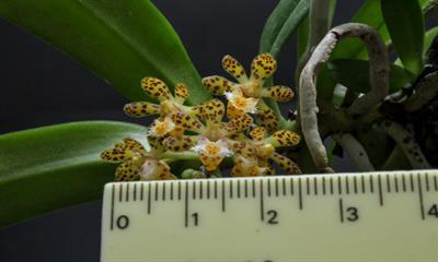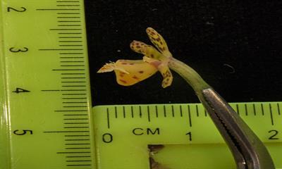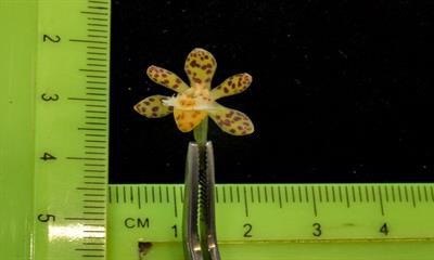 Ten stellate flowers and three buds on one corymb inflorescence 0.3cm wide x 2.5cm long, chartreuse stippled maroon, mounted on piece of cork 6.0cm wide x 11.0cm long, plant 12.0cm wide x 19.0cm long, leaves oblong, margins entire, apex unevenly bilobed, medium green, largest leaf 2.0cm wide x 10.5cm long, root tips green; flowers pale chartreuse with random maroon spots on distal two-thirds; sepals and petals obovate with obtuse apex; lip saccate, white basal one-third, chartreuse distal two-thirds with random maroon spots, spotted red on the inside, distal lip white with a central yellow spot finely stippled maroon, margins erose; column pale yellow with a pale maroon halo basally, anther cap yellow; ovary 0.1cm wide x 0.7cm long, pale chartreuse, stipple maroon; substance heavy; texture waxy; species native to Borneo, Java, Sumatra and Sulawesi; ID by SIFT _______________.Plant came from Kelly at High Desert Orchids