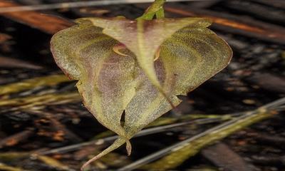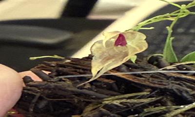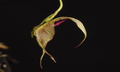 Two large flowers on two wiry inflorescences; inflorescence arises from behind the leaf; plant 1.5cm by 2.0cm, grown on tree fern placque 4.0cm by 6.0cm, roots covered by sphagnum moss; flower base color cream-white; dorsal sepal subulate, bent down; lateral sepals subulate, fused apically to medially, basally crossed; petals cuneate, folded over column, distally cream-white; column red, anther cap white; substance thin; texture luminous; recognized for rarity in cultivation; country of origin Mexico.