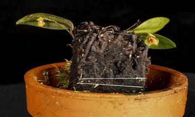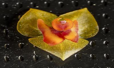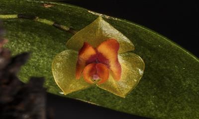One flower and two buds on two inflorescences presented underneath the green, elliptical, rugose leaves, on three growths to 2.58 cm tall; sepals translucent green, deltoid; lip butterfly-shaped golden yellow, margin and medial stripe red; substance firm; texture satiny. Species native to Dominican Republic (Sierra de Bahoruco). Purchased from Tarzane