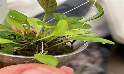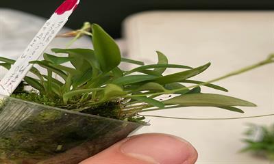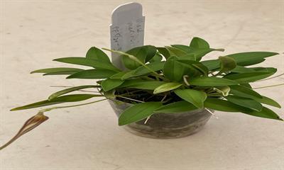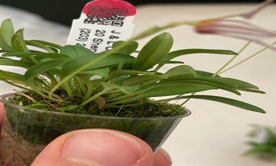 Two delicate, charming flowers and two buds on four suberect inflorescences to 5.3-cm, borne on a miniature plant of 46 growths, grown in a 4.5 cm plastic pot; leaves lanceolate, coriaceous, to 0.8 cm x 2.5 cm, margins entire; sepals white, golden yellow basally, overlaid fine red-purple venation; caudae to 1.6cm, yellow flushed rose; petals minute, linear-triangular, translucent white; lip oblong, apex rounded, white, overlaid fine red-purple venation; substance light; texture crystalline; commended for the presentation of disproportionately large flowers on a very compact plant.parental plant from peruflora