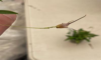 SITF confirms this plant as Masdevallia merinoi (Nov 2025). A description and drawing of the species may be found on-line on epidendra.com at https://epidendra.com/taxones/Masdevallia/Masdevallia%20merinoi/Masdevallia%20merinoi%20PROT.pdf which matches this plant. Although the flower measurements may be a little small, the callous on the petal lower half and the pair of calli on the lip can be clearly seen which match the description of this species. Also, the type drawing by Carl Luer and a photo of M. merinoi can be seen on the IOSPE website.