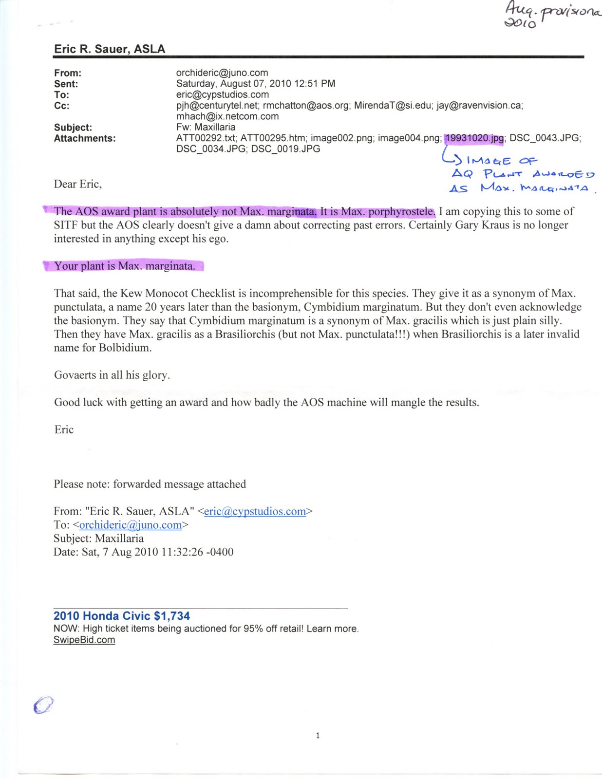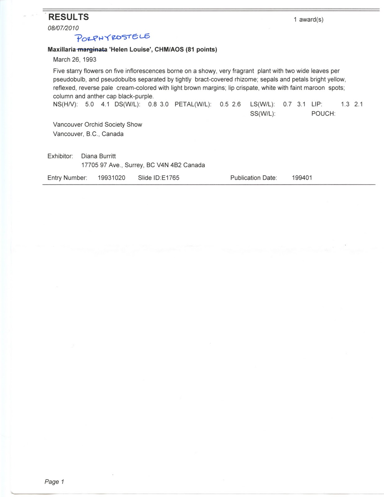 This maxillaria was awarded a CHM, notwithstanding that a plant by the same name has a prior CHM, based on a reasonable belief that its flowers more closely represent the taxonomic descriptions. If it is, in fact, Max. marginata, we will officially challenge the older CHM, which Dr. Eric Christenson believes is Max. porphyrostele. I am attaching the award slip, Dr. Christenson’s email identification with attachments, the award slide and two additional slides of the awarded plant.