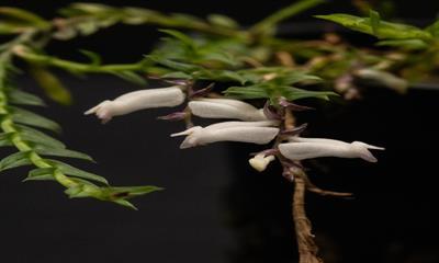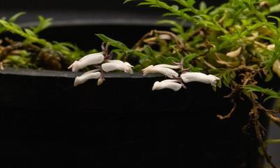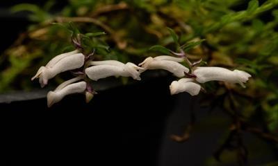Thirteen tubular flowers and three buds on seven fractiflex inflorescences to 0.7 cm; plant 11.0 cm wide x 15.0 cm tall growing in a 5.0cm net pot with sphagnum moss; stem terete, creeping, branching, carrying oblong, apiculate, broadest near the base alternating leaves, largest leaf 0.1 cm wide x 0.4 cm long, green, margins entire, floral bracts triangular, acute, concave, dark pink; root tips green; flowers 0.5 cm long, white with light pink blush on distal segments; sepals merged at the base forming a sort of long obtuse spur and ovate undivided labellum; lip triangular, pale yellow basally; spur white, broad; ovary pale pink, ridged longitudinally; substance light; texture crystalline; species native to Malaysia, Borneo and Java; flowers to small and delicate to dissect; ID by SIFT ____________________.