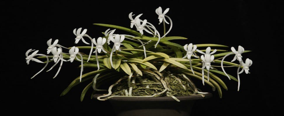 YOU MAY KNOW the quote, "My kingdom for a horse!" but what about a kingdom for an orchid? May be not a kingdom, but would you settle for a large estate? In the Edo period in Japan, approximately 400 years ago, there was one species of orchid that garnered such reverence that the presentation of a particularly fine specimen to the local elite — shoguns and samurai — could mean being granted your own estate. Neofinetia falcata, or "samurai orchids" were in fact, so esteemed that only those of the ruling class were permitted to own them. When viewing the shogun's plants, people were forbidden to breathe on the plants lest they contaminate the plants with their gems. For protection, the plants were often covered with screens and admirers were required to cover their mouths with paper when near a plant.