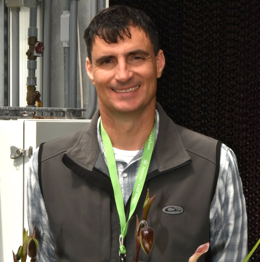 Professionally, Eron is a pilot, but he is also a very diverse orchid grower and hobby breeder. He received his first orchid (a cattleya) as a gift from his dad in 2002 and first started growing them hanging outside, on windowsills, and then under lights. His orchid collection really took off in 2008 after he built a greenhouse and now has about 1000 orchids. He specializes in Phragmipediums and blue Cattleyas and has even done his own hybridizing with them. His most recent passion are the Vandas! Eron has won many show trophies for best grown plants and best flowers and has won the coveted Best Grown Plant and Best Flower in Show multiple times with his orchids. His orchids have also received numerous AOS awards to date. Eron is the 2020 recipient of the AOS James and Marie Riopelle Miltonia award and the 2021 recipient of the AOS Roy T. Fukumura Vandaceous award. He received the AOSÂ Certificate of Meritorious Achievement in Orchid Education in 2023 and the AOS Team Award in 2024.