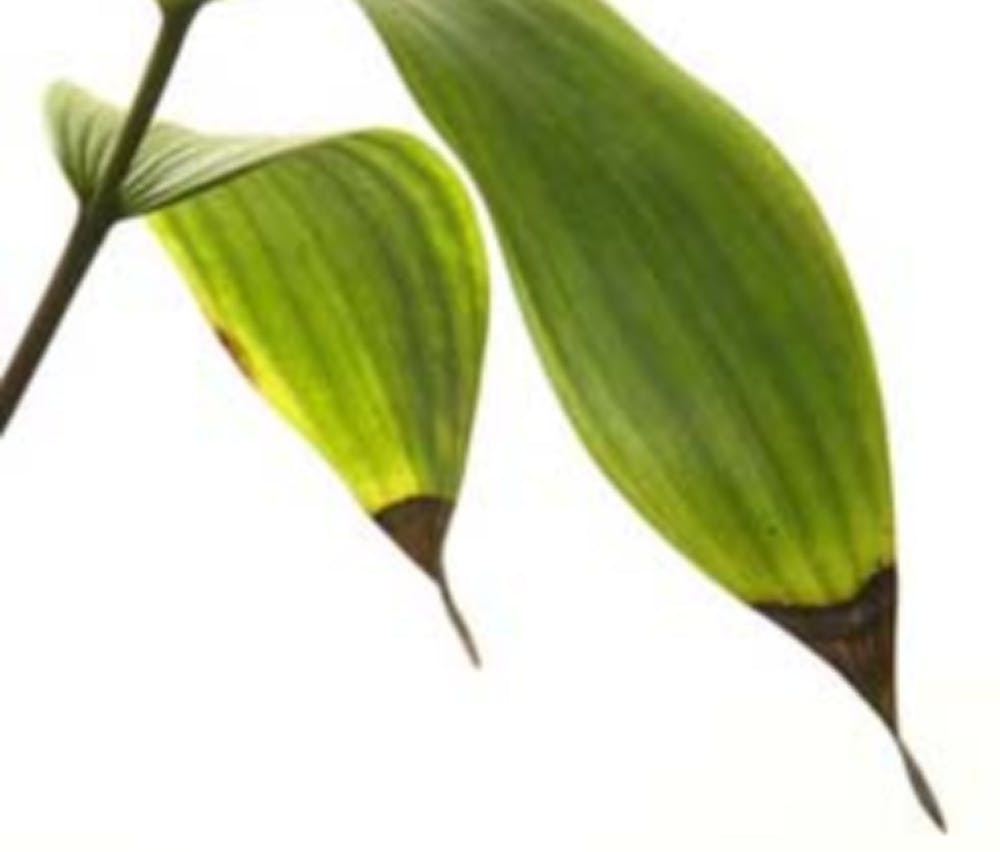 Lack of root growth may indicate an unhealthy concentration of mineral salts in the medium, on up to full fertilizer burn. If this is suspected, decant the plant and check its roots. Dead root tips, brown roots or salt crust on the potting medium surface are signs of trouble. In later stages, brown leaf tips may appear, indicating burned roots. Leaves, and eventually pseudobulbs on sympodial orchids, can become yellow. If allowed to continue, fertilizer burn will eventually kill the plant.