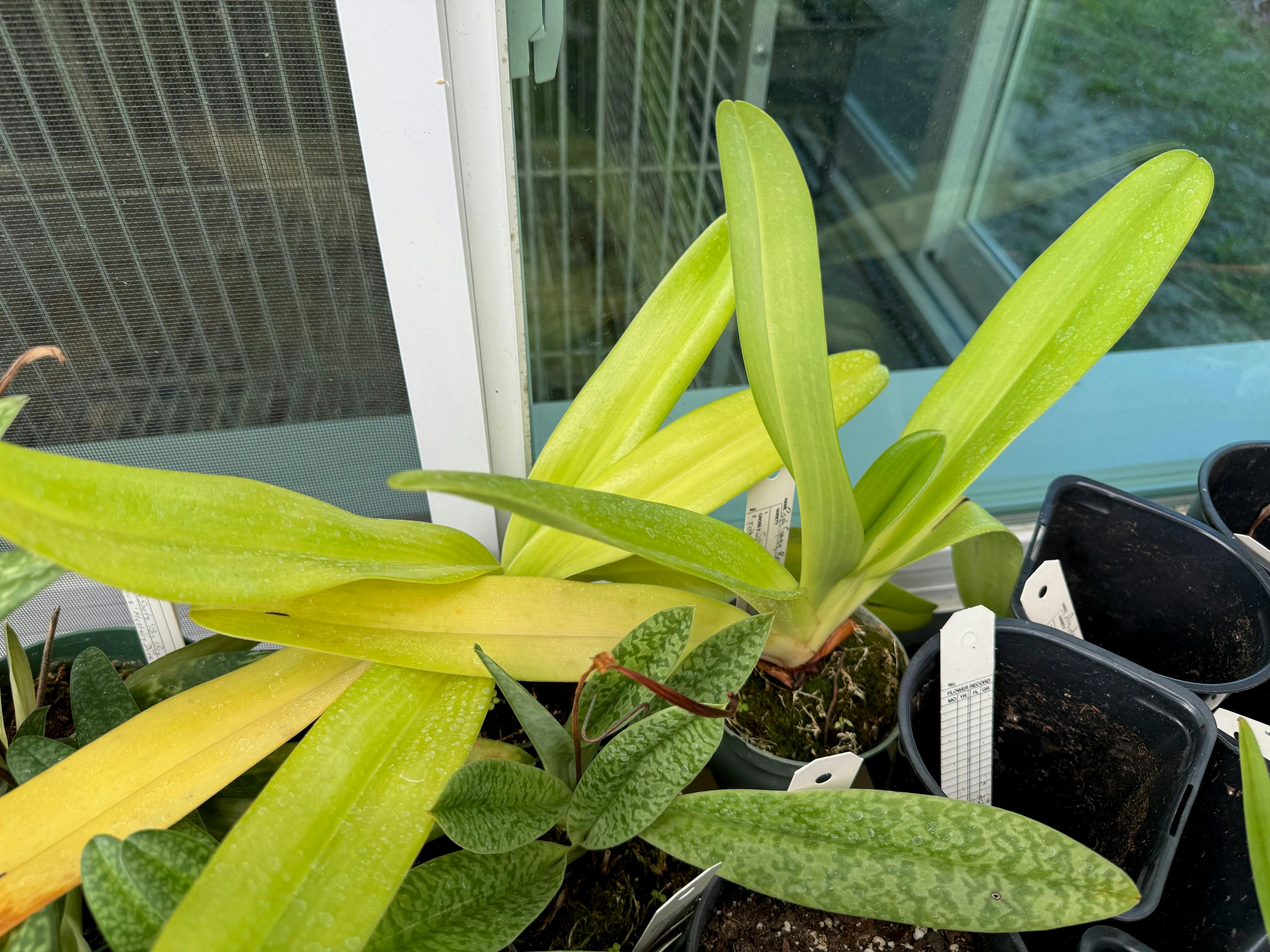 Calcium - Calcium is an essential component of the construction of cells walls. Unlike magnesium and nitrogen, plants cannot move calcium from one part of the plant to another so calcium deficiency shows up first in developing new growths that turn jet black beginning at the very tip of the leaves and progressing steadily down the growth until the entire growth dies. It is distinguished from black rot in that the border between normal green tissue and jet black necrotic tissue is very sharp with now yellow band characteristic of advancing fungal or bacterial infection. It is distinguished from salt-induced leaf-tip dieback and anthracnose infection in thin-leaved orchids in that it involves the new growths, the damage is jet black rather than brown or gray and the advancing damage does not exhibit lines like waves on a beach.