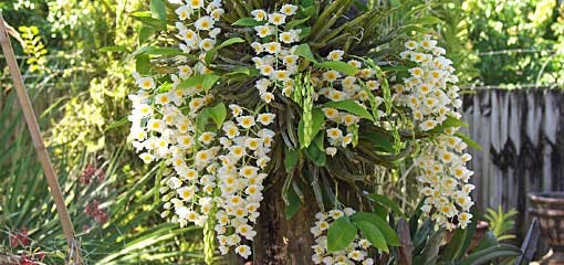 Provide adequate care, especially during the first few months. Mist with a hose, or run a sprinkler line up into the tree. Lightweight PVC pipes are easy to hold in place. Specimens near an orchid house respond favorably to the same care given to containerized specimens. Established plants are almost carefree, although periodic applications of water and fertilizer are beneficial. When it is necessary to prune trees on which orchids grow, take care not to injure the epiphytes. Once established, orchids last for many years.