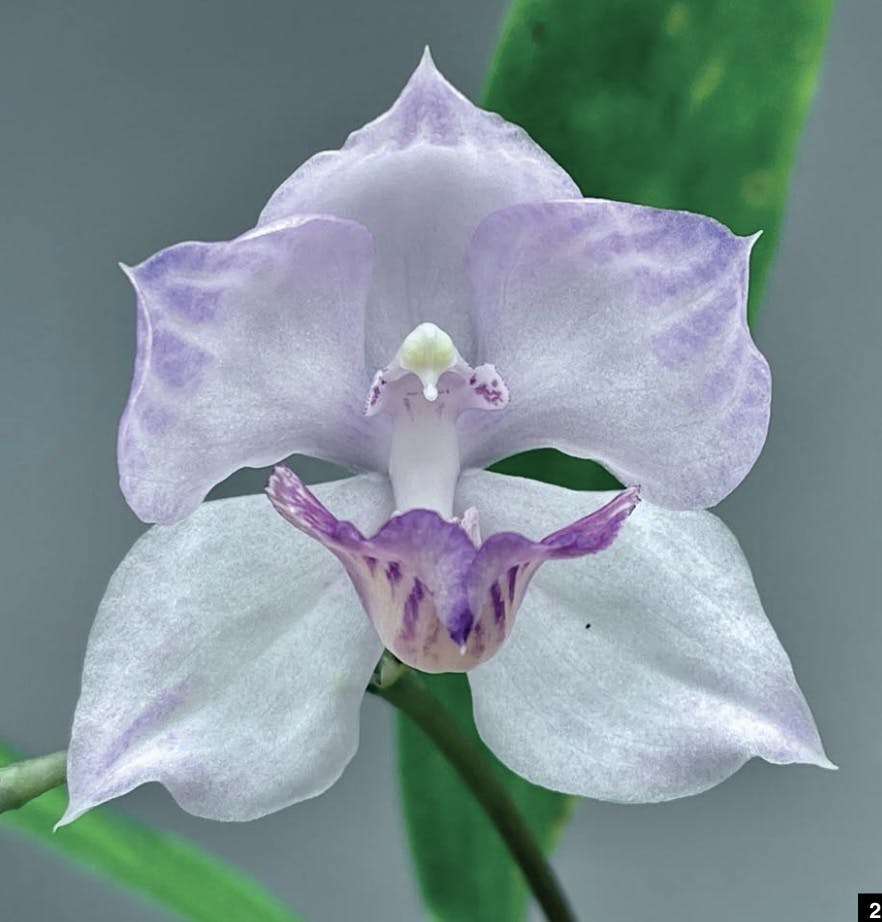 I noted this delicate, almost translucent, faintly blue, cupped flower posted on Facebook by Orchids Ltd. The flower pictured here is derived from a clone produced by selfing Orchidweb’s best clone called ‘Blueberry Creme’. The flower is faintly blue, accented by an indigo-purple lip. Sepals and petals are pale lilac, and petals are darker lilac distally. Flowers are 1.5–2 inches (3.8–5 cm) in diameter, and the flowering period can last for one to three months, depending on the temperature.