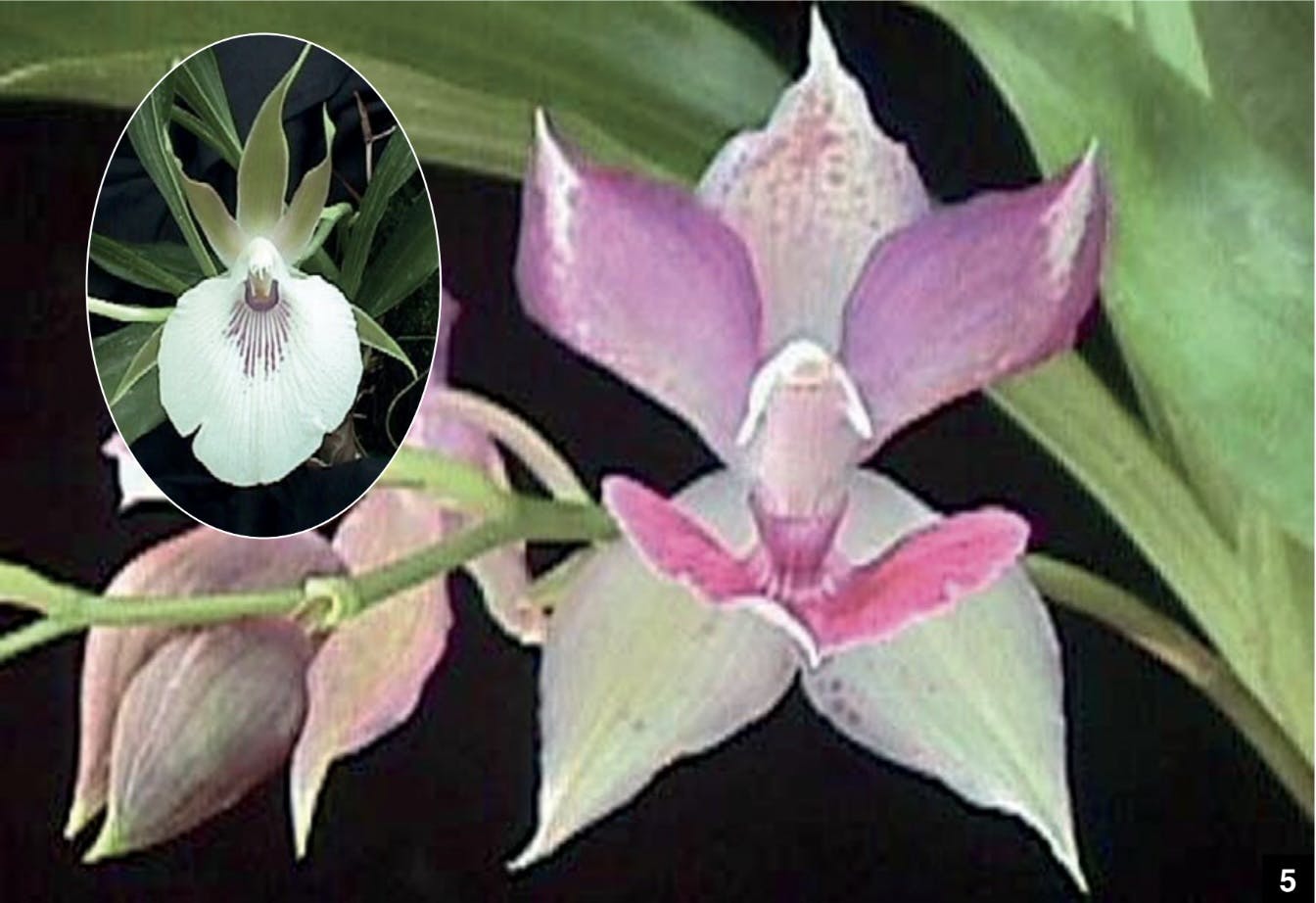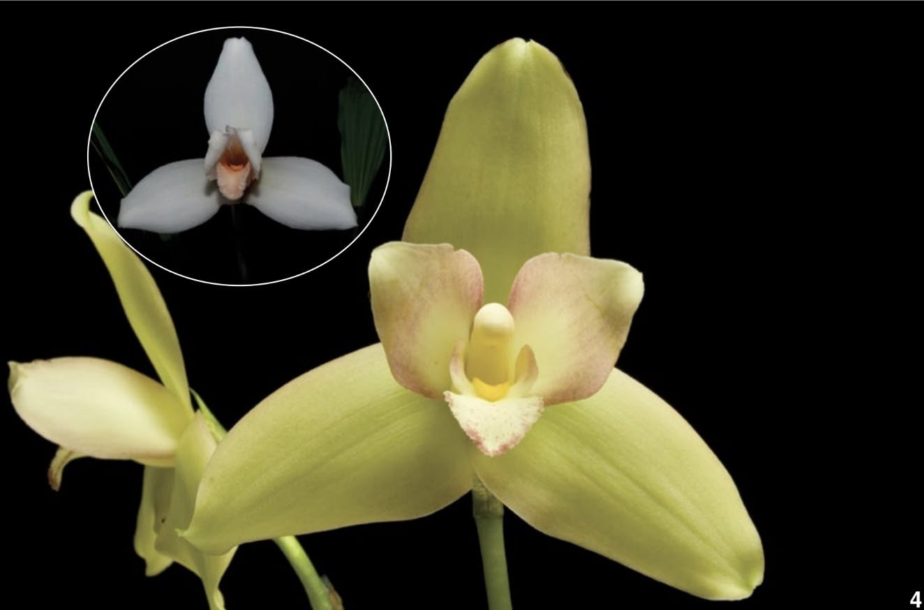 [4] Lycanisia Marie Riopelle ‘Allegro’ AM/AOS (q); exhibitor: Marie Riopelle; photographer: Patty Drake. In hybrids with Lycaste, the form is dominated by the Lycaste parent and only the petals appear to be modified to create a somewhat flatter flower. Inset photograph: Lyc. virginalis var. armeniaca ‘Claudia de Archila’ AM/AOS; exhibitor: Fredy Archila Morales; photographer: Jorge Arnulfo Carlos Sanchez.