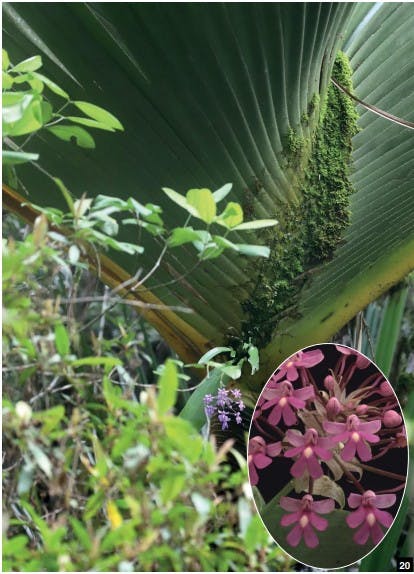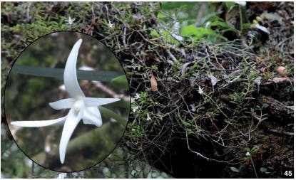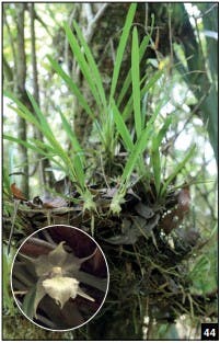 [44] Plants of Aeranthes nidus form a “nest” around tree trunks with the leaves catching falling vegetation and forming a microhabitat. The inset photograph is a close-up of a flower of Aeranthes nidus.
