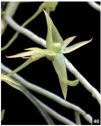 [27] The flowers of Aeranthes angustidens are suspended from 6-foot-long (1.8 m), wiry flower spikes; the plant is in the top left of the photo, the flowers right at the bottom.