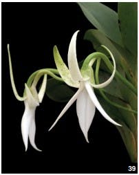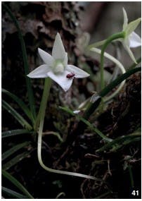[41] The large flowers of Angraecum lecomtei are carried on tiny plants in Maromizaha.