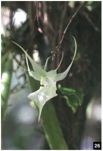 [17] Aeranthes caudata was in full bloom in the Ranomafana reserve; the flowers were almost 10 inches (25 cm) long.