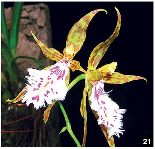 The genus Brassia was named after the explorer and plant collector William Brass. The epiphytic species are all native to tropical America from South Florida to Mexico and Brazil. This genus is also known as the spider orchid with its very long and narrow petals and sepals that look like spider legs. The pleasantly fragrant flowers, especially at midday, form a loose-flowered cluster. Plants should be watered abundantly from spring to fall. They also need plenty of light and good air circulation but not be exposed to the full sun. The room should be kept at a moderate temperature during this time. At the end of the growing season, watering should be slowly reduced to allow the bulbs to mature. During the dormant period, the plants should be kept somewhat cooler and drier. To ensure beautiful flowers next year, avoid early budding in winter.