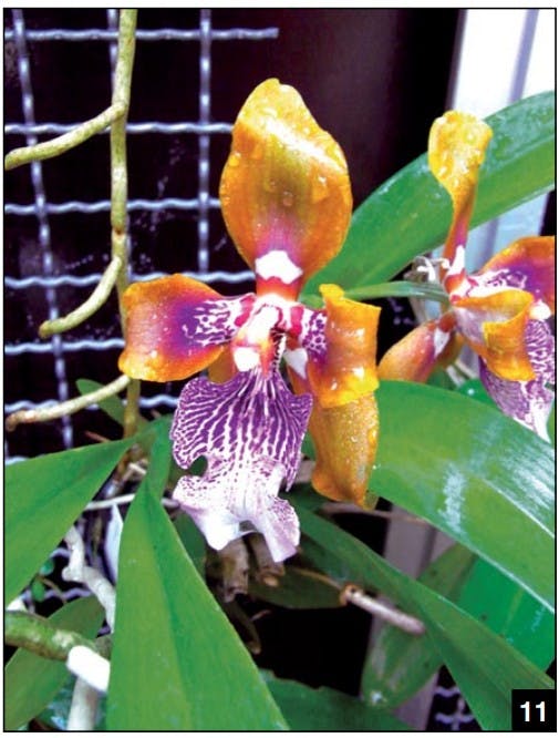 Oncidium grows in all cultural spaces and can be cultivated in greenhouses as well. Species such as Oncidium cheirophorum and Oncidium sotoanum (long erroneously called Oncidium ornithorhynchum) are compact-growing plants and can be cultivated together. The distribution of Onc. cheirophorum extends from Nicaragua to Costa Rica to Colombia. One or two multiflowered inflorescences with usually over 30 flowers appear from the bracts of each shoot. The fragrant, golden-yellow flowers last for four to six weeks. Oncidium sotoanum is widespread and a popular species among enthusiasts. Its habitat ranges from Costa Rica to Mexico. Usually, two inflorescences appear per new shoot. They can grow up to 20 inches (50 cm) high, hang downwards and are densely multiflowered. The flowers are very fragrant and have a beautiful, light purple to rose-red color. Both plants prefer a bright, temperate location. The optimum temperature is 64 to 77 F (18–25 C), dropping to 59–68 F (15–20 C) at night. Winter temperatures should be 64 F (18 C) during the day and 59 F (15 C) at night. In summer, when a new shoot is growing, the substrate should always be kept moist but must not be waterlogged. Therefore, water it well and allow the water to run off. In winter and after flowering, the plant requires a rest. Water enough to prevent the bulbs from shrinking too much. During the growth phase from March to October, fertilize only lightly every 14 days, as the roots of Oncidium are quite sensitive. Fertilization is suspended during the low-light period (November to February).