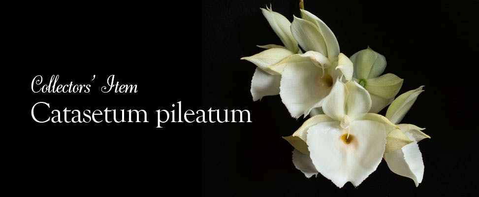 Catasetum pileatum is a lowland species where it occurs as an epiphyte. The species is adapted to hot, humid rainforest with only a short dry winter season and this is one species that may not go completely dormant for any period of time. Temperatures range from a maximum of 30C (86F) to a minimum of 15C (59F) and humidity is high at night even in the dry season. While actively growing, plants should be given as much water, warmth and humidity they will tolerate without damage to the foliage and ample fertilizer. These plants are heavy feeders and the goal is to produce the largest pseudobulbs as possible by the onset of late summer. After flowering and when leaves fall, the plants should be kept dry with high humidity and warm temperatures until the newly developing growths have roots about an inch long. With Ctsm. pileatum, this time interval can be quite short and successful growers provide a winter rest only if the plant's appearance indicates a need for dormancy. Plants are best grown potted. Some successful growers use straight sphagnum moss in clay pots top-dressed with time-release fertilizer (in low-humidity climates plastic pots will retain moisture longer). Others recommend bark or tree-fern based potting mix. Regardless of the mix chosen, it must hold adequate moisture, drain rapidly so excess moisture isn't a problem and aerate the roots.