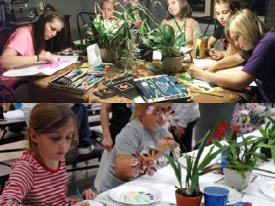 Materials include: live orchids, one of which can be pulled apart to show parts of the plant and the flowers, orchid books and magazines with pictures, Drawing supplies - markers, colored pencils, crayons, pencils, erasers, paper (Do not need all – erasers and regular pencils good, especially with older kids), heavy weight smooth paper, Duct Tape and Cardboard for mounting.