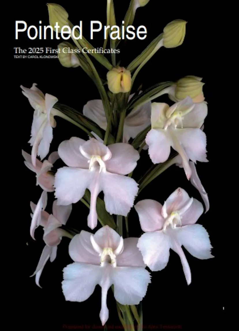 Our April issue traditionally features the FCCs from 2025 and the new year-end special annual awards. This April's issue is, in a word, lavish. Carol Klonowski presents the 2025 FCCs - all 116 of them! If that weren't enough, Nile Dusdieker's article entitled "Orchid Championship" presents the Society's 25 special annual awards in living color. In addition, this issue contains Part 3 of Graham Guest's series entitled "The Easton Dossiers" with spotted cymbidiums.