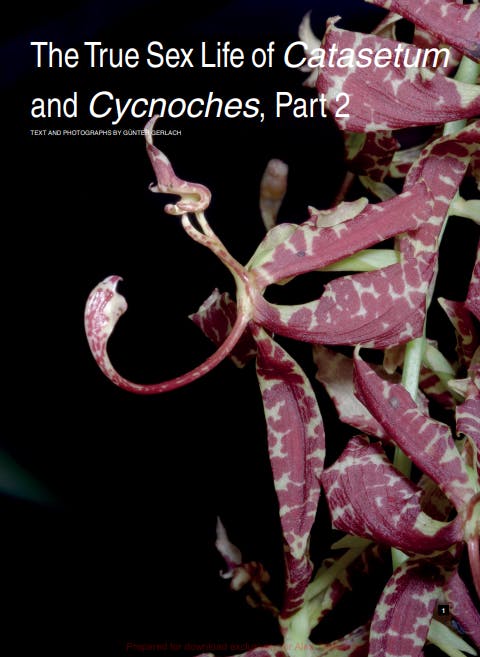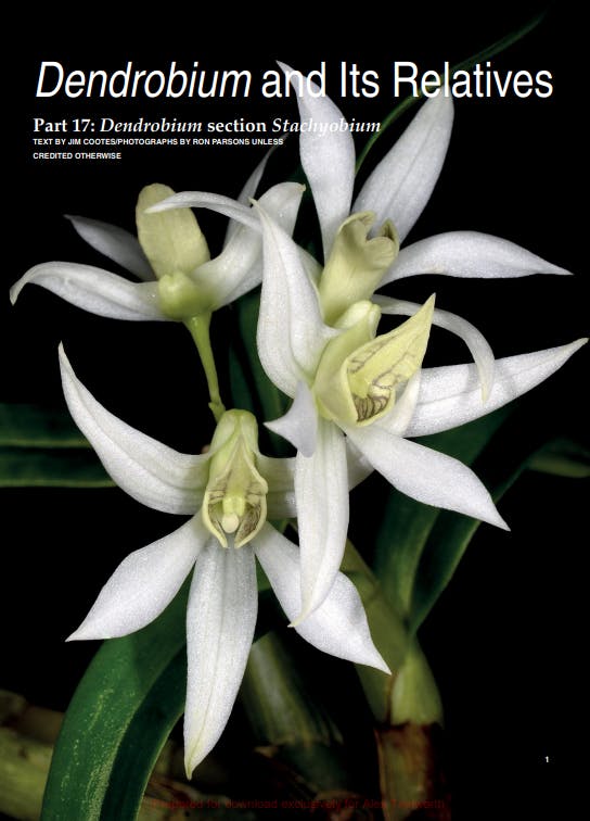 Jim Cootes continues his series on the genus Dendrobium with Part 17: Dendrobium section Stachyobium, a widespread section comprising some 44 species ranging in size from miniature to plants with 2-foot canes. Günter Gerlach completes his two-part article on the sex lives of Catasetum and Cycnoches and Stephen Van Kampen-Lewis, Francisco Miranda and Christopher Maupin take us on an adventure in Brazil searching for Cattleya nobilior f. amaliae. Rounding out our features this month is an historical article by Dr. Joseph Arditti on the study of phytoalexins in orchids. These compounds, produced by various plant families following infection by pathogens or colonization by symbionts, such as mycorrhiza help to fend of pathogenic or colonizing fungi - sort of an immune system response in plants.